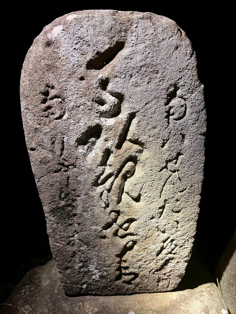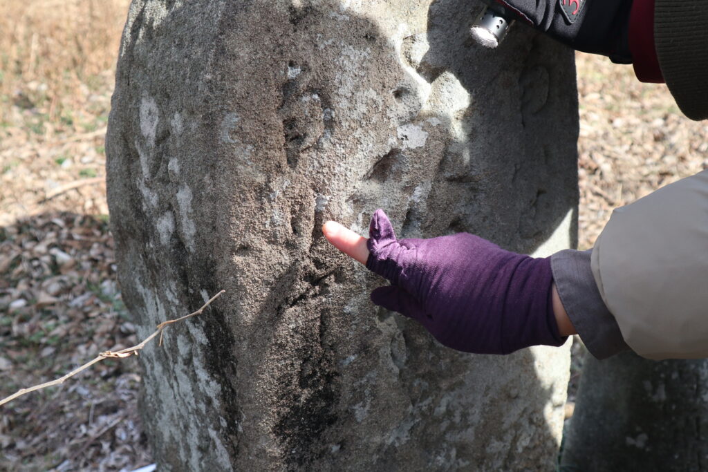私たちは再度ファミマに戻り、幕柳、町場、別所を抜け、黒川神社に向かいました。途中、道標好きの我妻さんにある道標に連れて行っていただきました。道標の正面には仙台や利府の地名、サイドには松島や吉岡の地名が書かれていました。