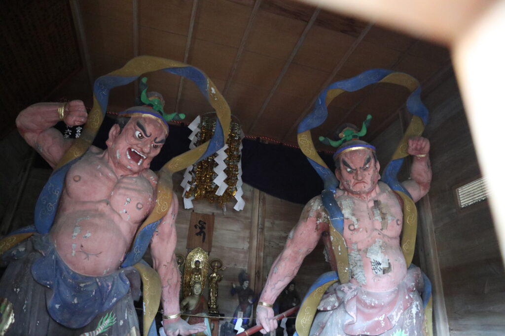 写真の仁王像は室町時代の作、奥に映っている金ぴかの仏像が薬師像かと思いましたが、薬師像は本殿に納められている秘仏で60年に一度御開帳されるそうです。