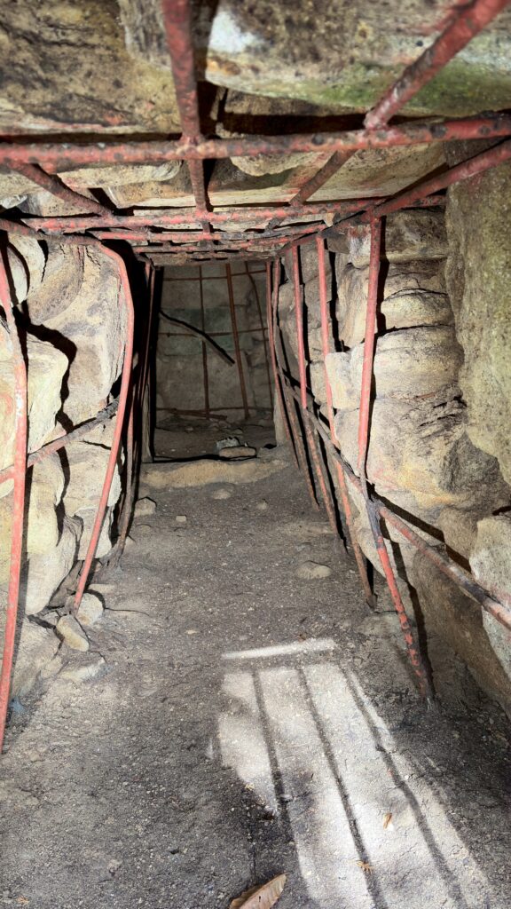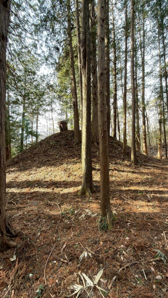 それから古墳ですが、境内の一角から続く道があり、100mほど行くと、一号墳を見つけることができました。古墳時代後期の直径18mの円墳がほぼ原形のまま残っており、古墳の中も鉄柵の外から眺めることができました。古墳を勉強するのにとてもいい場所だと思います。