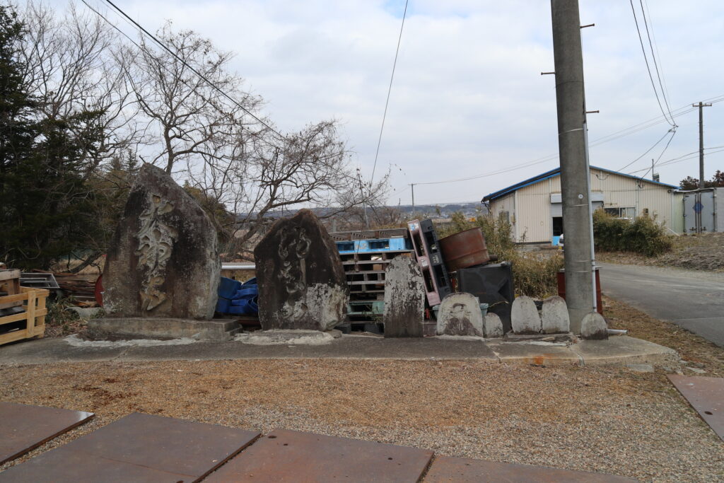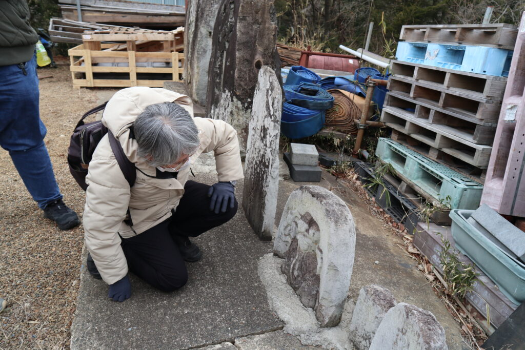 ここから東北自動車道の高架下をくぐり、宮ノ沢溜池というところで石碑群を見つけました。「大神宮」「湯殿山」「庚申塔」などの石碑がありました。今回も道標マニアのWさんが詳しかったです。