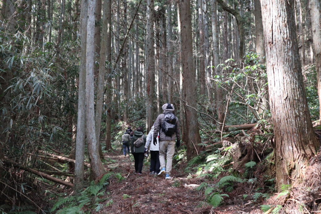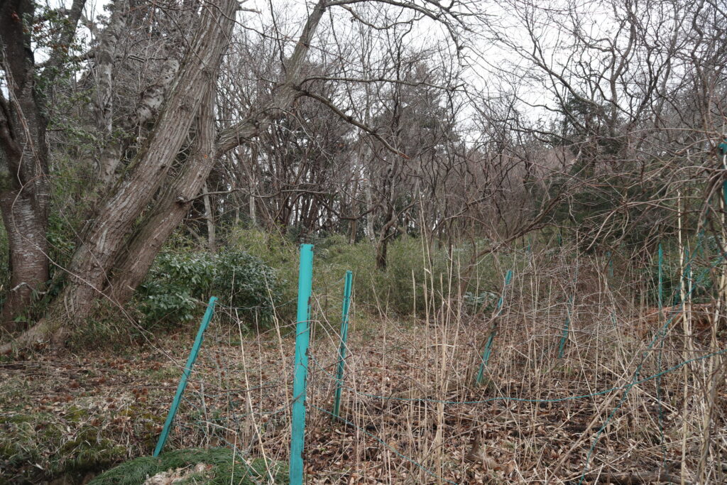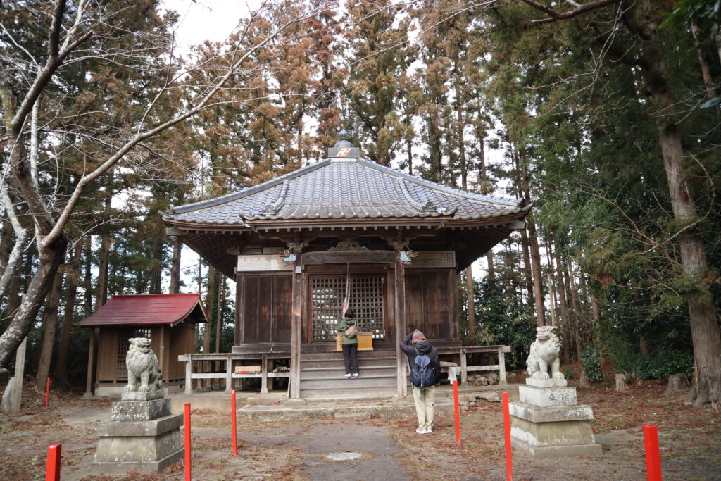坂を下りて、ゴルフ場の脇を抜けると、観音堂と呼ばれる集落があります。昔の地図を見ると、ここに神社のマークがあるので、神社や寺院のありかを確かめたかったのですが、残念ながら柵で中に入れず見れませんでした。地元の方に話を聞くと、今でもここにはお堂があり、毎年契約講の行事で訪れているそうです。