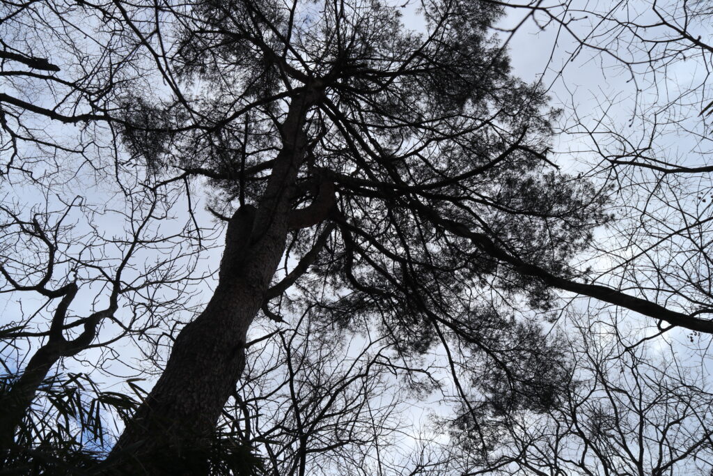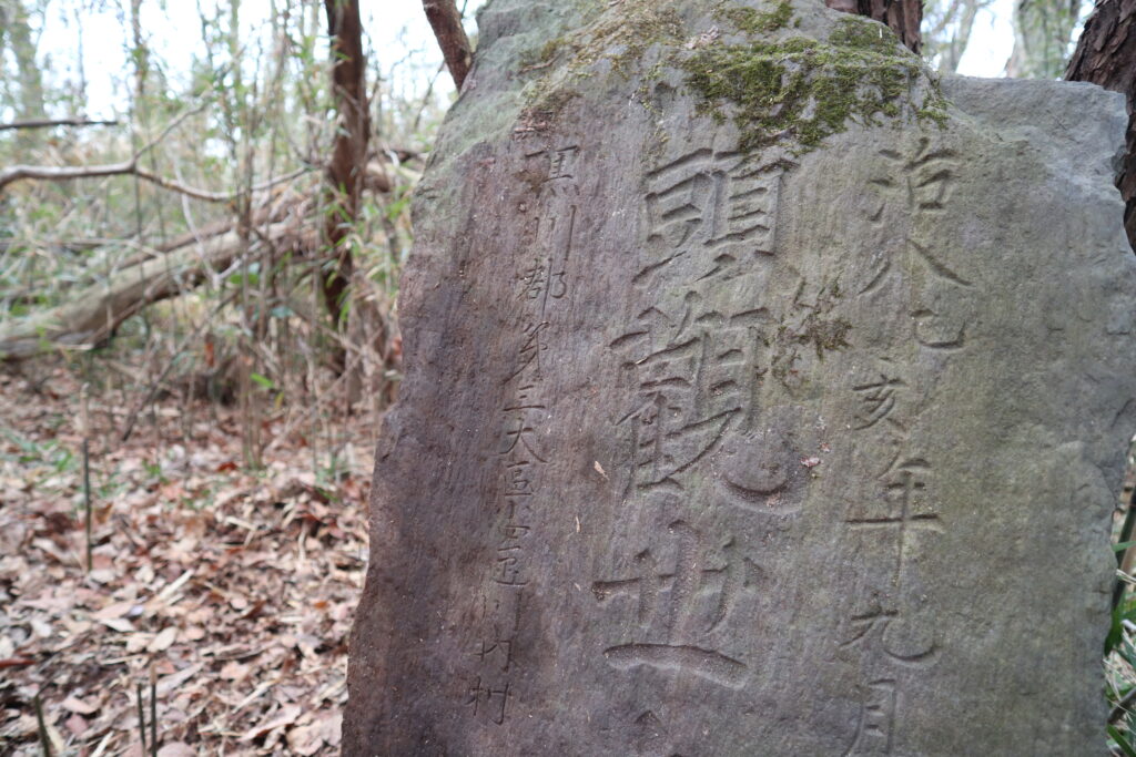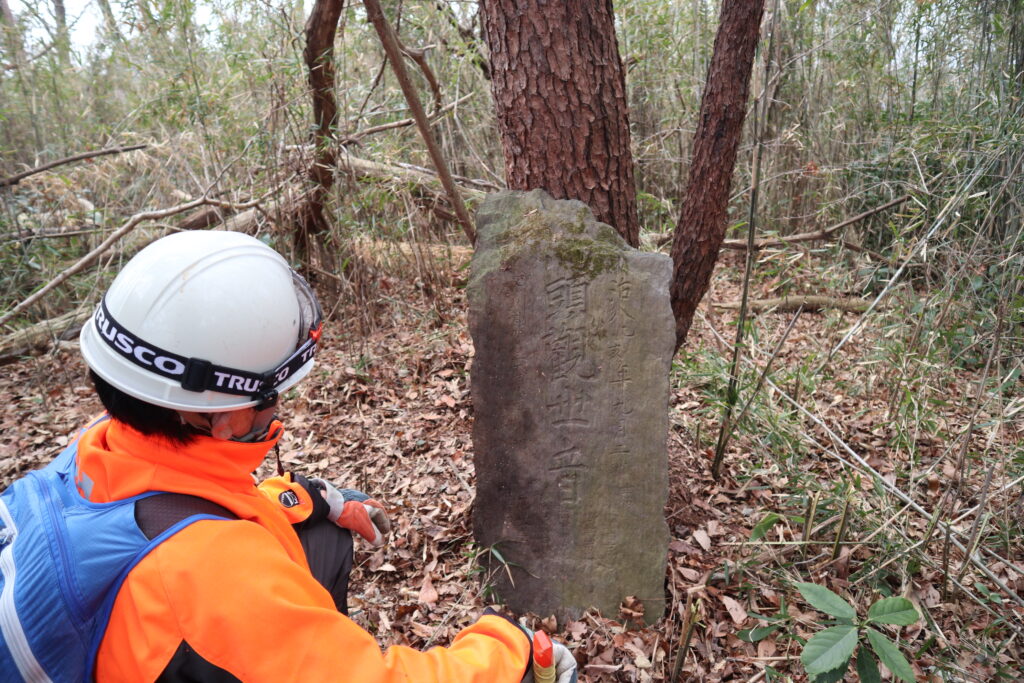 西番から北西方向への道は、比較的苦労せずに切り開けました(最初の地図参考)。藪はあるもののそんなにひどくないといった感じです。私たちを驚かせたのは、大郷町に下りる道と春日方面に下りる道が交差するところで、大きな松と石碑を確認したことです。石碑は明治8年の馬頭観音、大郷町川内村の住民によるものでした。おそらく、旅の安全や道標として置いたものでしょう。松もまた、峠の目印として植えたものだと考えられます。私たちは倒れていた石碑を松に立てかけ、作業を再開することにしました。