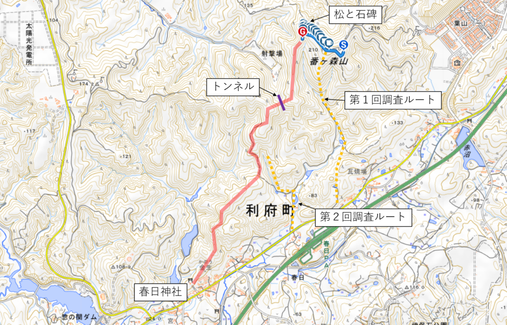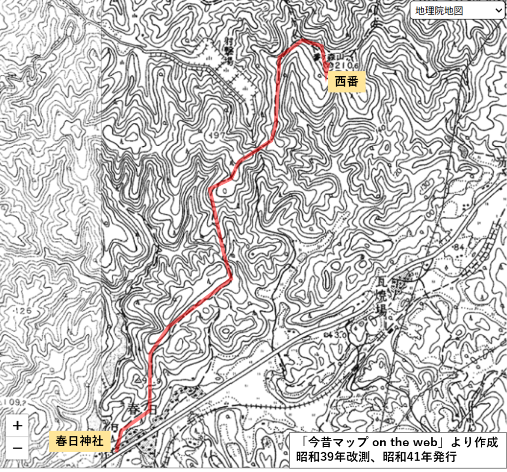 ということで、東番の山頂に登ったあと、西番(=番ヶ森のもう一つの山頂)に向かい、そのまま尾根を通って春日神社まで抜ける道をつくりたいと考えています(=地図上赤線)。