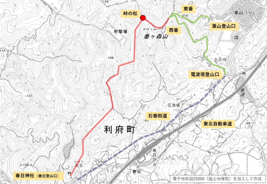 さて、この番ヶ森には登山口が一つしかありません。いや、正確に言えば、もう一つ、山頂の電波塔に向かうための道路があります(=地図上緑線参考)。しかし、後者の道はアスファルトですし、葉山登山口と距離が近くトレイルのルートとしては物足りません。また、石巻街道と呼ばれる車通りの多い道に出るので、通行も心配です。トレイルのルートとしては、できれば使いたくない。